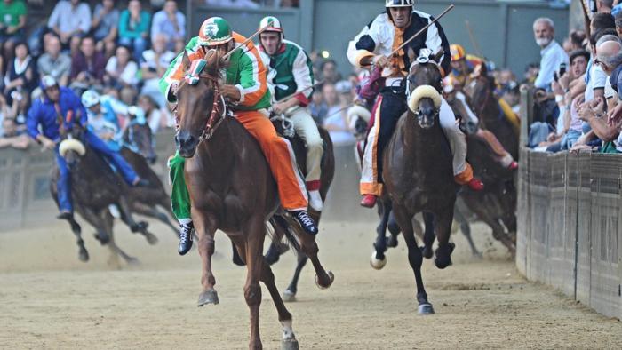 Vince il Palio, rinviato ad oggi per la pioggia, la contrada della Selva con il cavallo Polonski e il fantino Giovanni Atzeni, detto Tittia. Un risultato che tutto sommato non e’ una sorpresa perche’ la coppia della Selva era indicata tra le favorite di un Palio che peraltro molti definivano incerto. La corsa non ha avuto storia perche’ la Selva e’ partita in testa seguita da Lupa, Oca e Chiocciola mantenendo sempre la posizione. Tittia, fantino di 30 anni, nato a Nagold in Germania ma originario sardo, ha guidato la corsa con autorevolezza e ha realizzato il suo quinto successo, mentre per Polonski e’ il quinto. Per la Selva invece e’ la 38° affermazione.