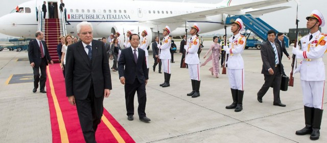 Il presidente della Repubblica, Sergio Mattarella, e’ giunto al palazzo presidenziale di Hanoi dove, accolto dagli onori militari, incontrera’ il presidente della Repubblica socialista del Vietnam, Truong Tan Sang. Durante il colloquio, che sara’ seguito dalle dichiarazioni alla stampa, il ministro dello Sviluppo Federica Guidi e il suo omologo vietnamita firmeranno il piano d’azione 2015-2016 per l’attuazione del partenariato strategico tra Italia e Vietnam e l’accordo sulla cooperazione e mutua assistenza amministrativa in materia doganale.