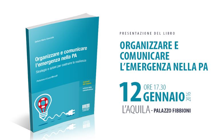 Il libro di Stefano Cianciotta, docente di Comunicazione di Crisi all’Università di Teramo, dal titolo “Organizzare e Comunicare l’emergenza nella Pubblica Amministrazione”, pubblicato da Maggioli, è il primo del suo genere in Italia e costituisce l’occasione per discutere della necessità di pianificare e adottare misure di prevenzione, di informazione ed educazione capillari ai cittadini in cui istituzioni scientifiche, Protezione civile, Forze Armate e amministrazioni locali devono svolgere un ruolo coordinato con la partecipazione attiva e consapevole delle popolazioni e dei media. La prefazione del volume è stata scritta da Luca Mercalli, autore e conduttore del programma televisivo di RaiTre “Scala Mercalli”, che ha avuto il merito di sdoganare sulla televisione pubblica i concetti di cui parla il testo.