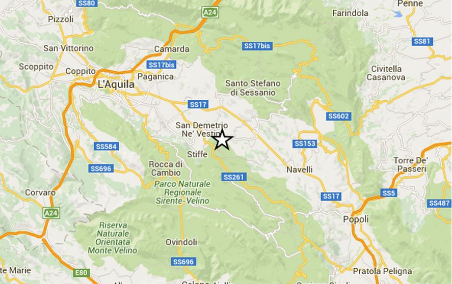 L’epicentro in zona sud est, nei pressi di San Demetrio. I paesi più vicini all’epicentro sono Villa Sant’Angelo, Fontecchio, Prata d’Ansidonia, Fagnano.