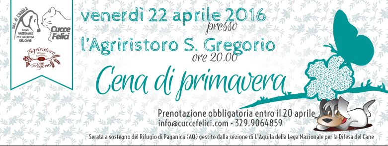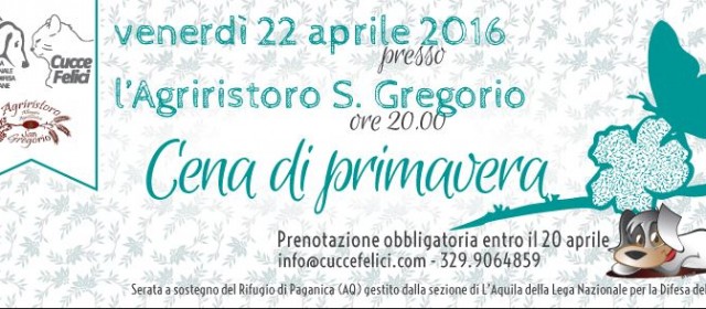 Si svolgerà il prossimo 22 aprile, alle ore 20.00, presso l’Agriristoro San Gregorio la Cena di Primavera organizzata dai volontari della Sezione locale di Lega del Cane. L’evento servirà ad avvicinare chi ancora non conosce l’Associazione e a mostrare il lavoro quotidiano dei volontari che, 365 giorni all’anno, accudiscono amorevolmente i più di 400 cani ospiti del Rifugio di Paganica, oltre ad occuparsi dei randagi sul territorio e dei controlli attraverso il Nucleo provinciale di Guardie Zoofile, nato in seno a Lega del Cane L’Aquila nel gennaio 2013.