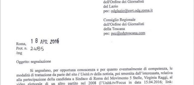 “Lunedì il segretario dell’Ordine nazionale, Paolo Pirovano, ha invitato i Consigli regionali della Toscana e del Lazio ad attivare i consigli territoriali di disciplina per una valutazione deontologica di azioni e omissioni”. Ne da’ notizia il presidente dell’ordine dei giornalisti Enzo Iacopino a proposito del caso Unita’-Raggi. Pirovano (come si legge nell’allegato) segnala “per opportuna conoscenza e per quanto eventualmente di competenza, le modalita’ di trattazione da parte del sito l’Unita’.tv della notizia, poi smentita dall’interessato, relativa alla partecipazione della candidata a sindaco di Roma del Movimento Cinque Stelle, Virginia Raggi, al video elettorale di un altro partito nel 2008”.