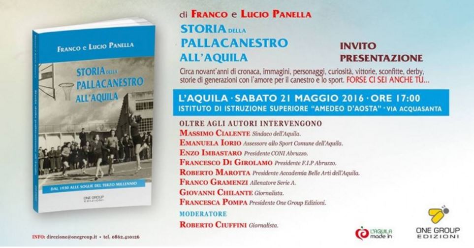 A presentare il libro all’appassionato pubblico degli sportivi saranno gli stessi autori Franco e Lucio Panella con il sindaco dell’Aquila Massimo Cialente, l’assessore allo Sport Emanuela Iorio, il presidente del Coni Abruzzo Enzo Imbastaro, Francesco Di Girolamo, presidente F.I.P. Abruzzo, Roberto Marotta, presidente Accademia delle Belle Arti dell’Aquila, l’allenatore della serie A Franco Gramenzi, il giornalista Giovanni Chilante, che ha dato un significativo contributo alla realizzazione del volume, e Francesca Pompa, presidente One Group Edizioni. A condurre l’incontro il giornalista Roberto Ciuffini.