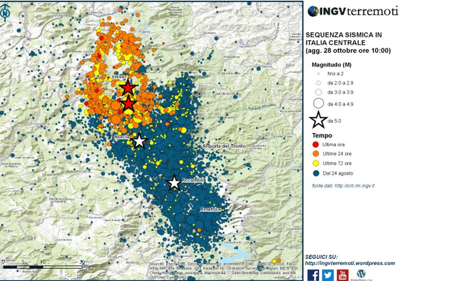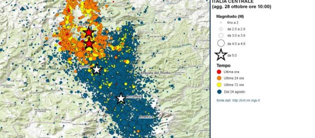La Rete sismica nazionale dell‘Istituto nazionale di Geofisica e Vulcanologia (Ingv) ha localizzato oltre 900 scosse, dopo le forti scosse del 26 ottobre, di 5.4 alle ore 19.10 e di magnitudo 5.9 alle ore 21.18..
