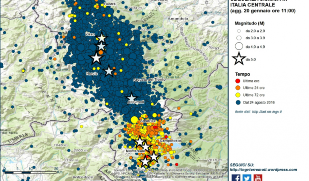 Rispetto all’ultimo aggiornamento di ieri alle 11, non si sono registrati eventi di magnitudo maggiore o uguale a 4.0, mentre sono stati una decina i terremoti di magnitudo compresa tra 3 e 4 localizzati dalla Rete Sismica Nazionale dell’INGV, prevalentemente nell’area a sud tra le province dell’Aquila e Rieti.