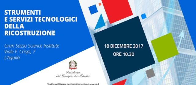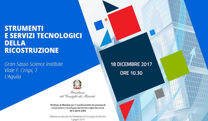 Lunedi 18 dicembre alle 10,30, presso l’Aula Magna del Gran Sasso Science Institute, si svolgerà l’evento dal titolo “Strumenti e servizi tecnologici della ricostruzione”, durante il quale saranno analizzati alcuni degli strumenti informatici sviluppati per la gestione dei processi di ricostruzione e, in particolare, per la trasparenza dei dati, a partire dai web gis, dal sistema di tracciabilità delle macerie e dal sistema Open Data Ricostruzione. Saranno inoltre presentati i progetti ‘INCIPIT” e per l’anello ottico ed il progetto dei sottoservizi della Città de l’Aquila, finalizzati a dotare il territorio di maggior livello di smartness.