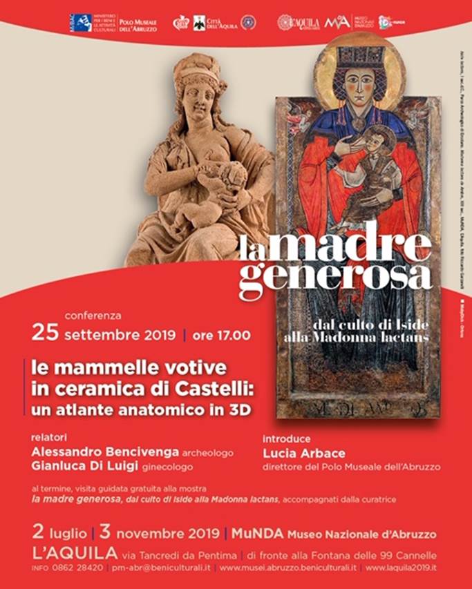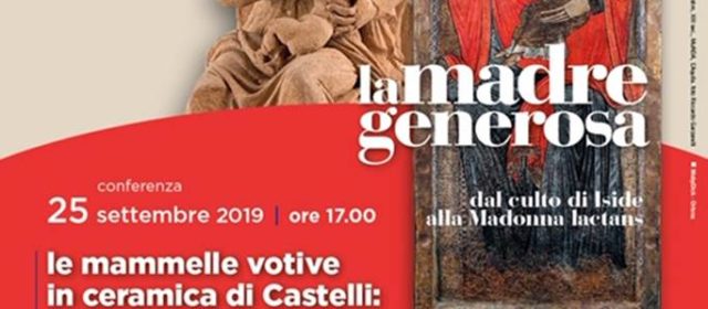 – mercoledì 25 settembre alle ore 17.00 conferenza “Le mammelle votive in ceramica di Castelli: un atlante anatomico in 3D” a cura degli esperti Alessandro Bencivenga e Gianluca Di Luigi. Gli studiosi hanno evidenziato come fossero evidenti, nei diciotto reperti in terracotta o maiolica di Castelli raffiguranti seni votivi, i segni delle malattie. E come la devozione, in assenza di cure efficaci, abbia contribuito a consolare e lenire l’universo femminile, lasciando testimonianze particolarmente efficaci dal punto di vista documentario con una rappresentazione di intenso realismo.