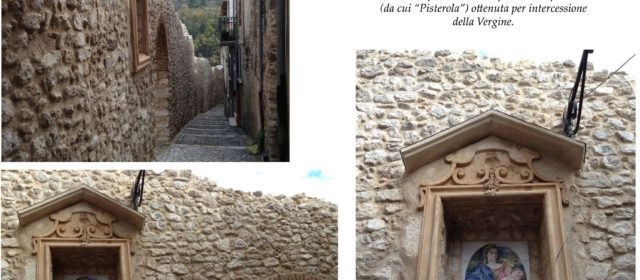 Ma torniamo all’edicola della “Pisterola”. È lecito supporre che al fondo di essa, in origine, fosse dipinta una Madonna con Bambino, poi corrosa dal tempo e sostituita da un’analoga composizione in tela stampata che risultava del tutto scolorita agli inizi degli anni ‘70. Per interessamento di Don Demetrio Gianfrancesco (1922-2004), zelante e compianto parroco nonché storiografo rigoroso, nel 1976 vi fu collocato «un pannello di maioliche riproducente una Madonna col Bambino addormentato in braccio» (D. Gianfrancesco, Assergi e S. Franco; Roma 1980, p. 73).