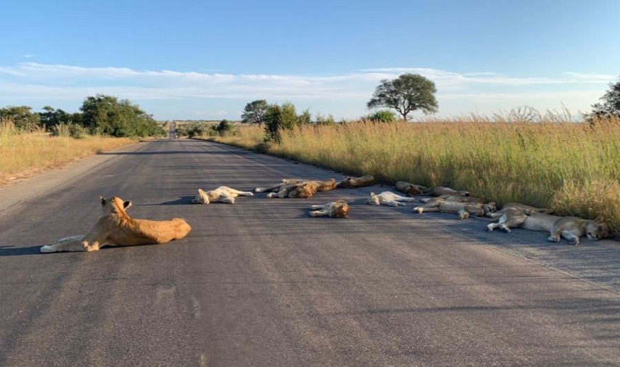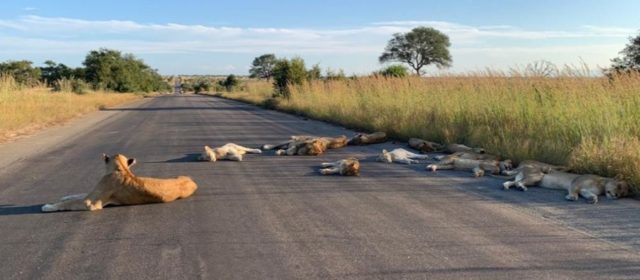 Un branco di una dozzina di leoni e’ stato avvistato placidamente addormentato nel mezzo della savana sudafricana. Fin qui nulla di strano, eccetto il fatto che il luogo prescelto dai felini e’ l’asfalto di una strada generalmente molto trafficata dalle vetture dei turisti nel Kruger National Park.
