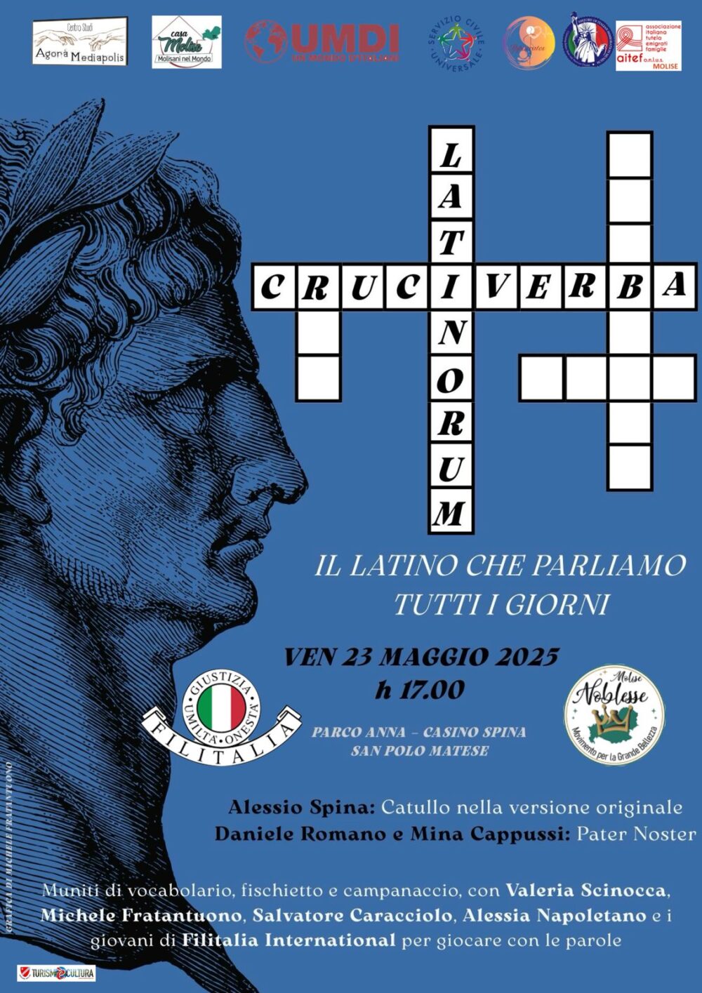 Un’iniziativa culturale promossa da Filitalia International Bojano progetto Molise Noblesse Movimento per la Grande Bellezza, quotidiano internazionale UMDI Un Mondo d’Italiani,in collegamento con Philadelphia. Un pomeriggio speciale, gratuito e aperto a tutti, di cultura, gioco e riflessione, pensato per avvicinare il pubblico – soprattutto i più giovani – alla lingua latina, non come lingua “morta”, ma come viva eredità che continua a parlare attraverso le parole di uso quotidiano, i testi classici e le nostre radici culturali, da riscoprire assieme agli Italiani nel Mondo.