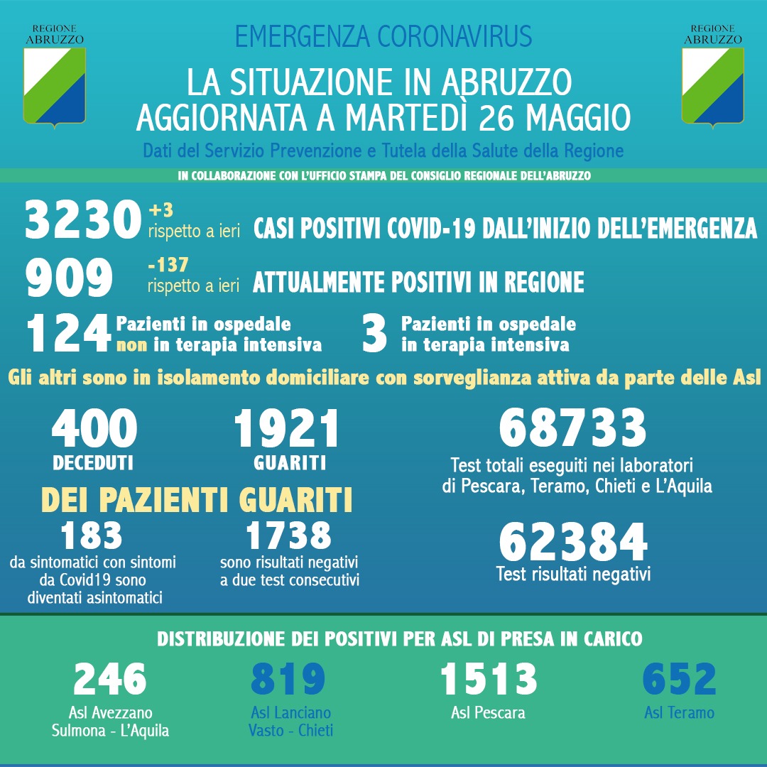 In Abruzzo, dall’inizio dell’emergenza, sono stati registrati 3178 casi positivi al Covid 19, [...]