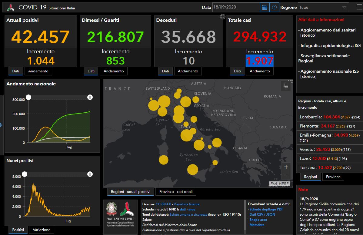 Coronavirus: 1.907 nuovi contagi su 99.839 tamponi, 10 i morti