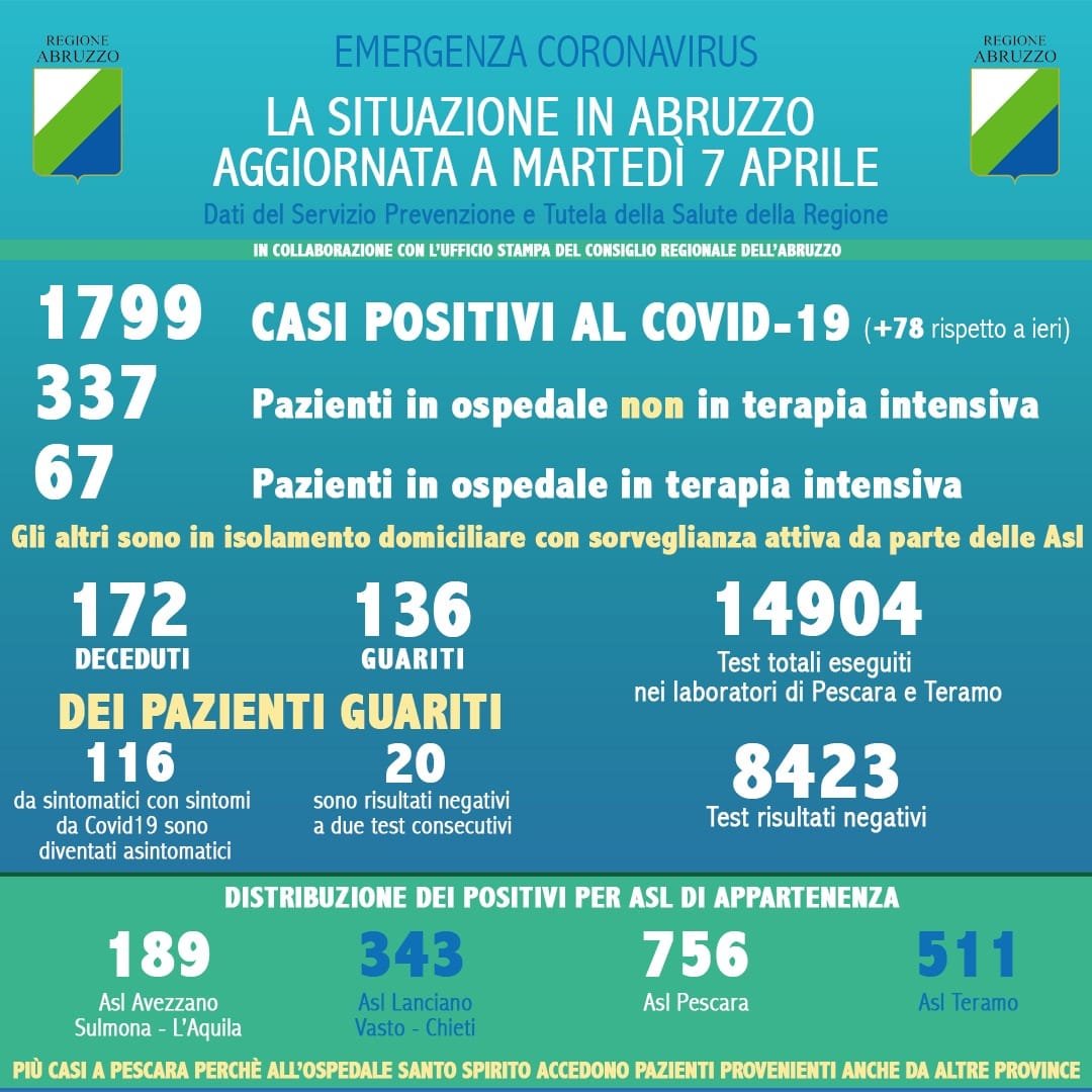 Coronavirus. Abruzzo: salgono i contagi, 78 nuovi casi
